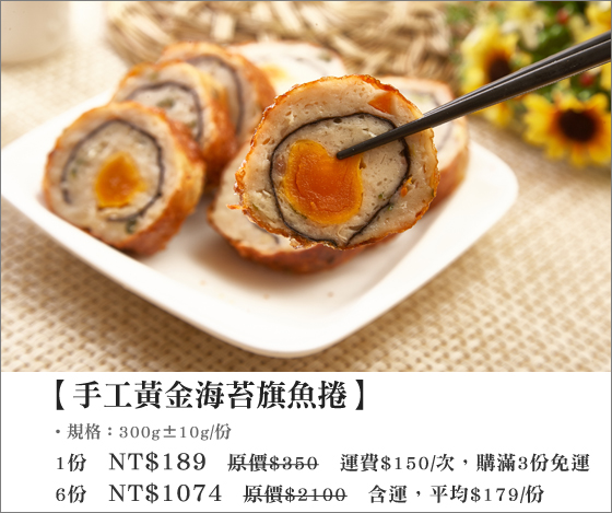 平均每份最低只要179元起(3份免運)即可購得手工黃金海苔旗魚捲1份/6份(300g±10g/份)。