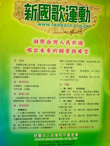行走於校園中,海報欄中出現了這樣一張海報---新國歌運動,主辦單位為財團法人台灣和平基金會。回到家中搜尋了相關網頁,海報上的歌詞與歌曲的甄選時間為6月12日以及8月31日。而新國歌運動網頁上的甄選辦法,歌詞甄選截止改為8月24日,歌曲則延到12月31日,這到底是怎麼一回事呢?