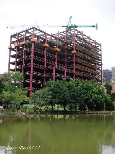 醉月湖畔新蓋的不只這一棟,幾年前就蓋好的化學新館(照片中後方較大的那棟...)早就矗立在那,更奇怪的是,在台大的教學大樓一期新建工程先期規劃構想書第14頁中寫到化學舊館將拆除作為永久綠地,第17頁就說化學新研究大樓B棟要蓋在化學系館原址....怪怪