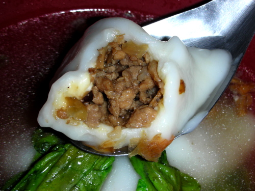 這間看起來普通的湯圓店賣的湯圓非常特別,強調的是古早味,然而走的是客家風味,和我們一般說得傳統湯圓其實略有不同,外觀看上去是三角稜線形狀,其內餡是類似客家菜包,內含蝦米、油蔥等,是將全部的餡料炒過後再包進湯圓,還有點醬油鹹的辣。這種自製的純手工湯圓比起其他湯圓還要大許多,一口咬下去...嘖嘖~你一定可以吃出他用糯米(不是用糯米粉加水)純手工製作的不同。這分古早味湯圓的湯底則是採用油葱、芹菜切碎淋上傳統的高湯清燙時蔬(冬天是茼蒿,夏天則以小白菜等為主...),非常大眾口味,冷冷的冬天吃上一碗這樣的鹹湯圓真的感覺暖暖的感覺都上來了。