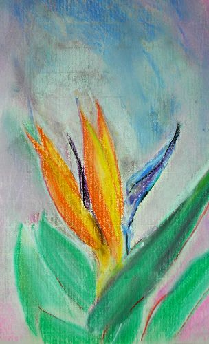 拿著粉彩筆,我靜靜的完成這天的功課,叔叔說:「天堂鳥不常開花,今年還有開,真令人訝異!」圖畫後頭的背景色據說是“心靈空間”,我卻仍抗拒著表示畫作的主角更能表現心靈,為什麼要將心靈擺在背景...我不懂,這樣不是很容易人格分裂嗎?於是堅決相信:主角就是心靈。