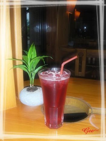 除了美觀之外,洛神花也是製作美麗果汁的聖品,祂的果實除了酸之外,本身帶點澀,製作成飲品後,有如檸檬般治療感冒的療效,但是感覺又不似檸檬容易因糖分添加的多寡而影響其酸鹼。製作成酸酸甜甜清涼退火的紅色自然果汁(圖二),舒筋補血,養顏美容,更打破了一般紅色植物性中平溫熱,具有溫潤補氣功效的刻板印象。雖然說同樣有通順血路的功能,一般紅色系列果汁採上行溫補顧眼睛脾胃,而洛神花卻是採下行暢通血路,除了有助女性恢復女性生理功能外,亦添加了降低高血壓的附屬功能,同時熟知內情的人更會把祂搗碎製作成紅色貼布以舒筋散熱。然而...其實我最喜歡的,還是祂做成果汁時那種沁涼酸甜的夢幻感覺