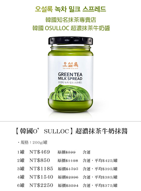 平均每罐最低只要375元起(含運)即可購得【韓國O’SULLOC】超濃抹茶牛奶抹醬1罐/2罐/3罐/4罐/6罐(200g/罐)。