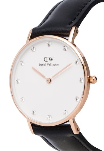 Daniel Wellington 的Classy Sheffield 34mm 鑲鑽手錶,採經典設計玫瑰金色裱框,有施華洛奇晶鑽的刻度顯示鑲嵌,搭配個性黑色皮革錶帶,展現和諧與華麗的雋永之美。