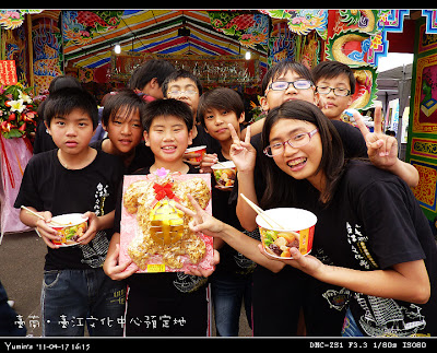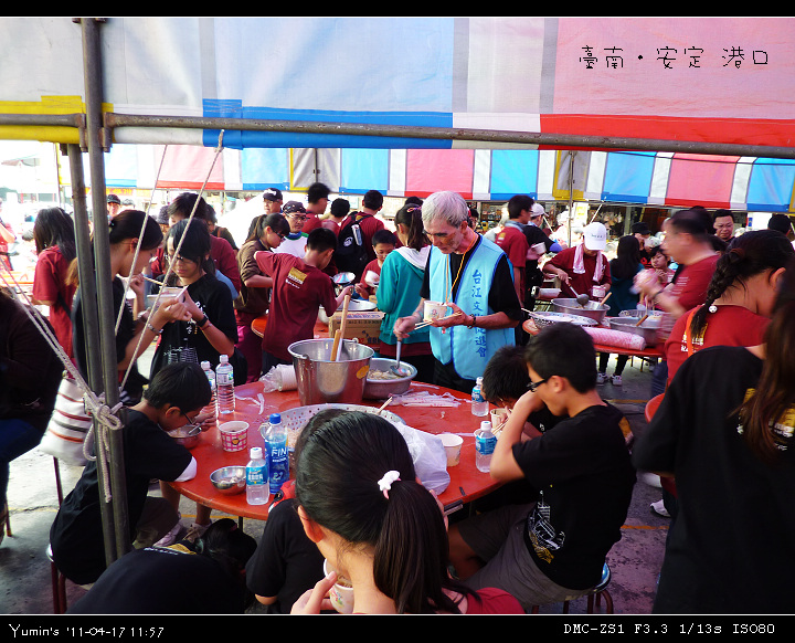 中午在臺南安定區的港口慈安宮用餐,廟方很用心,魯麵、米粉、酸菜鴨肉、綠豆湯、仙草茶、運動飲料,外加西瓜,真是飽足啊!