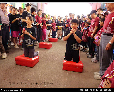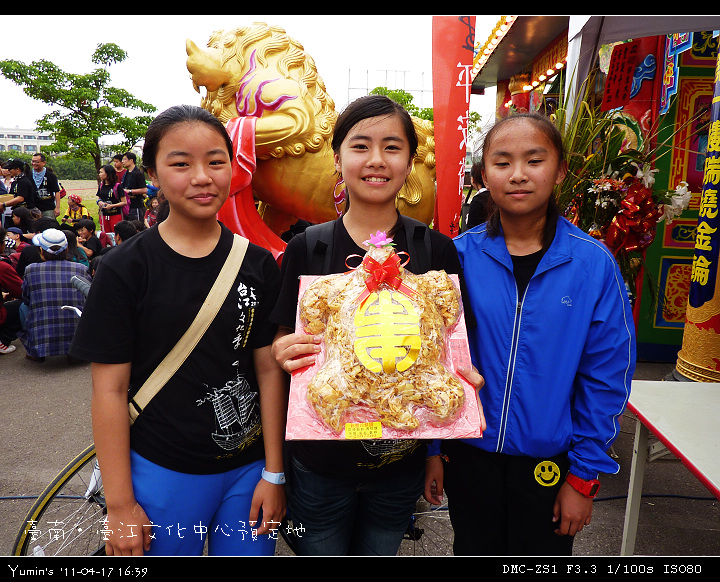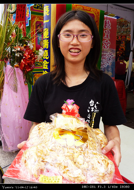 最後的壓軸是「卜平安龜」的活動,由參加的各團體派出代表卜爻,獲勝者可得三台斤「麵粉酥龜」一隻。我們又派出了福星智揚參賽,去年他是一卜中的,抱得平安龜回校,今年果然不負眾望,又擊退了眾強敵,再度抱得平安龜,真是了得,讚啦!