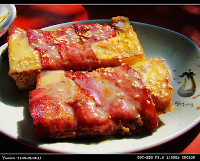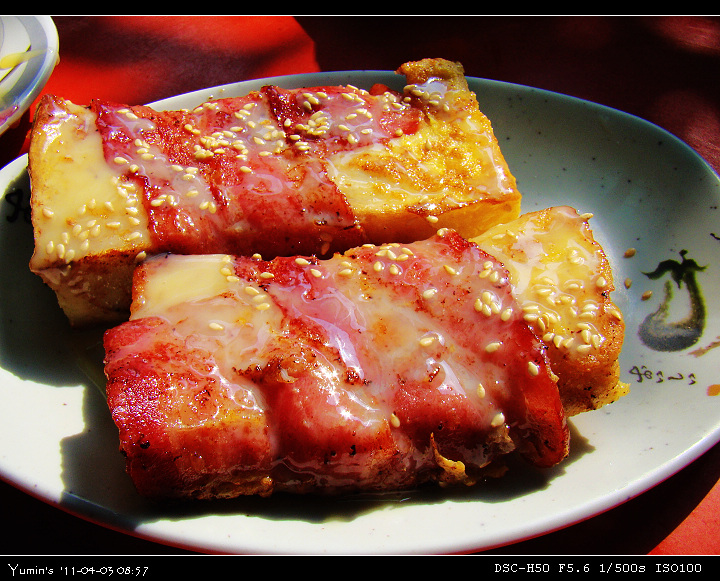 美亞美招牌早餐之一,法式土司夾培根,再淋上煉乳,超讚的!