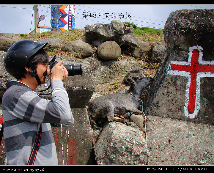 這張照片還滿駭人的。尤其是阿圖,拍完照,突然被看來奄奄一息的山羊突然的竄動嚇了一跳!這隻被綁著的山羊,到底是為了什麼,綁在「肉粽角」上,然後一旁的十字架畫飾,又是什麼用途呢……