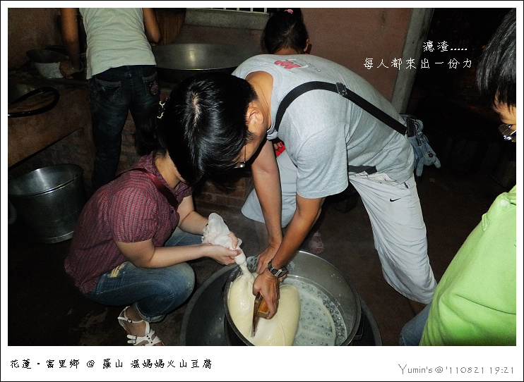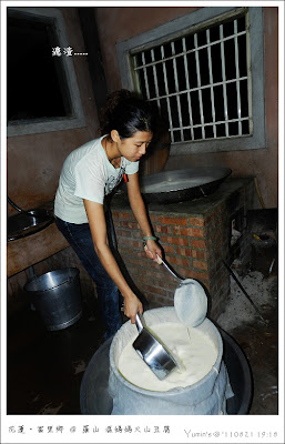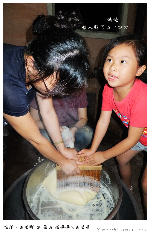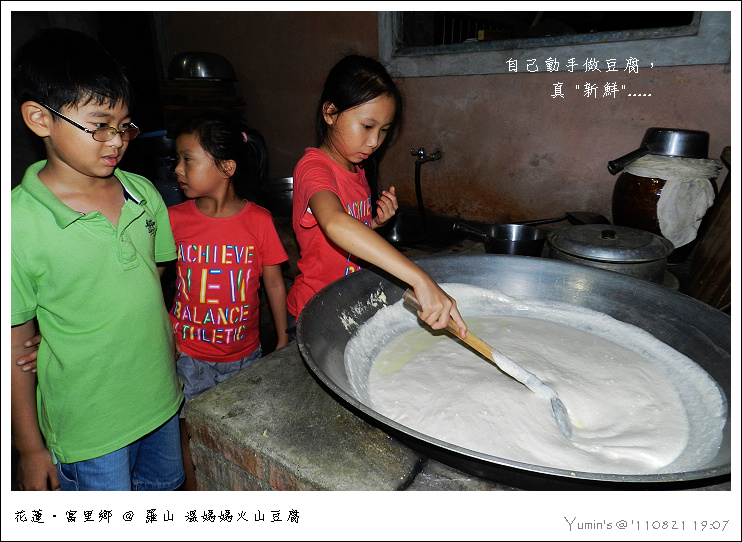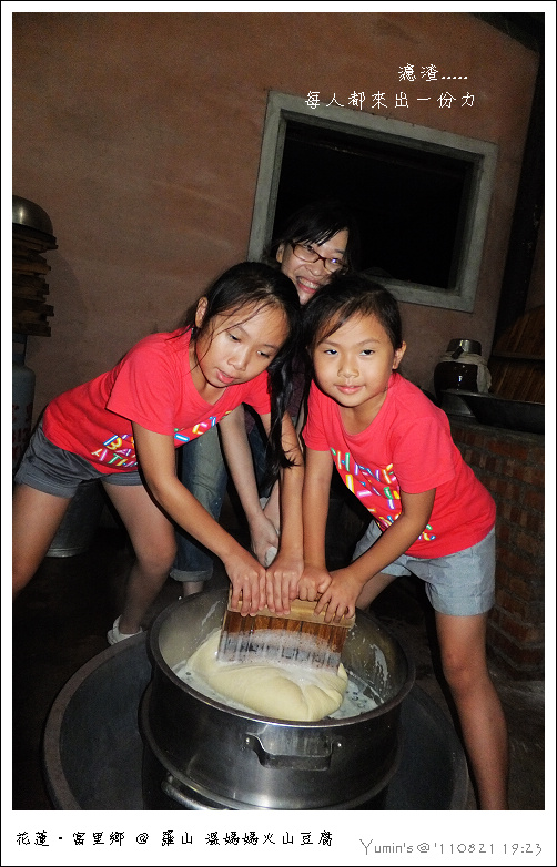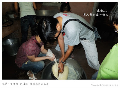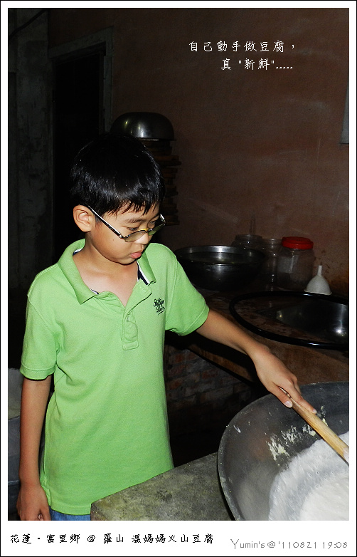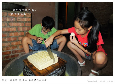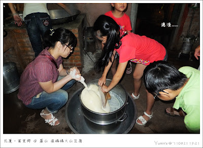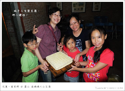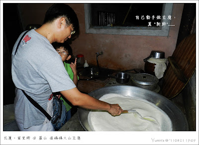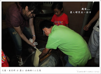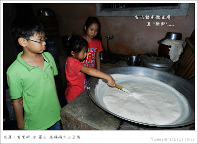 除此,孩子們能從頭體驗,傳統的灶燒材、煮豆、擠壓(就差沒有石 磨磨豆,可惜!),直到成品出現,一整套的DIY,真讓他們開了 眼界,啵兒棒!