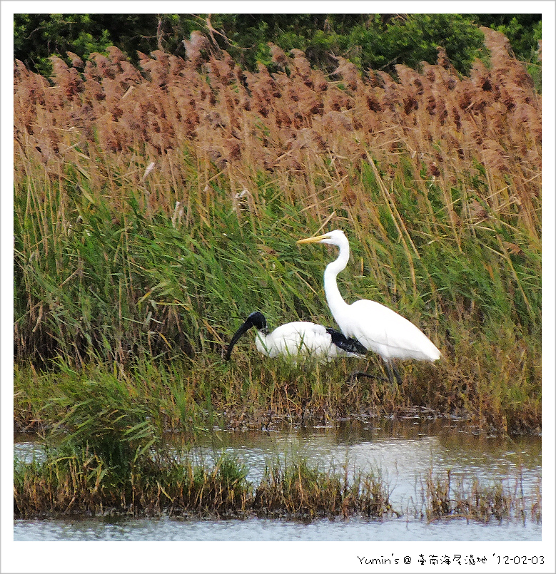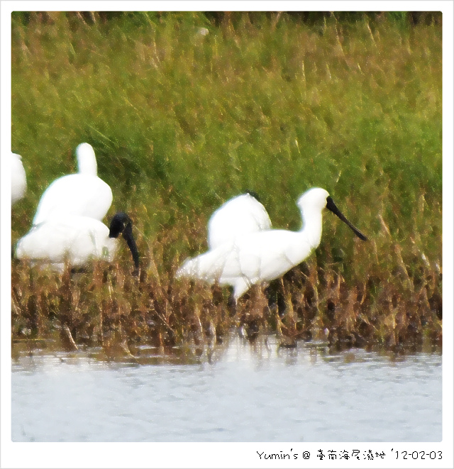 所以能在我家附近的這塊「海尾濕地」看到黑面琵鷺,可說相當偶然;印象中,只在近三年前巧遇(http://blog.roodo.com/tncorn/archives/8213593.html)。一來這裡不過牠們的主棲地,二來,如前所言,我也未曾死忠的守候牠們。總是想說,在這個季節,「騎車踅踅,罔當罔當」,欸,想不到就給我碰上啦!所以當昨日在海尾濕地再見牠們,而且還跟多隻埃及聖鹮湊在一塊兒,可真是開心得不得啦!雖然沒多久這些黑面琵鷺就飛走了,但也夠我高興個好幾天了 ^^ ! ★ 2012-02-03 黑面撓杯,去互我當著囉!