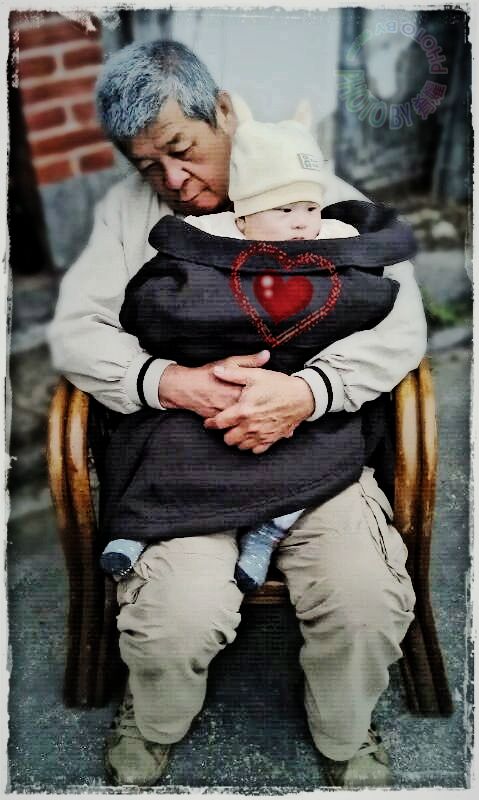 照片中帥帥的黃阿公,有著多位美麗千金,而這位懷中可愛的孩子正是眾位美麗千金之一所有,難得的團聚時刻,捨不得將孫子放手,即使愛睏,也要緊緊抱著,而孩子似乎也感受到阿公對他的思念與濃情,乖乖地不吵鬧的待著.