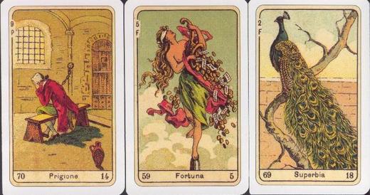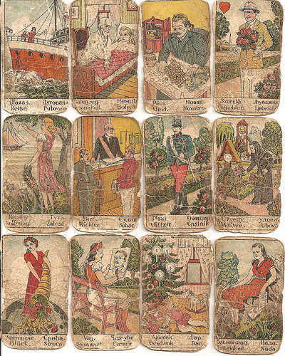 我在匈牙利的維基百科找到了它的相關資料,稱為Ciganykartya,留學匈牙利的朋友告訴我就是Gypsy Cards的意思。資料說這種牌源自印度,原本在一種宗教儀式中使用。14世紀開始在歐洲出現,最早可以追溯到1507年,從德國和法國開始流行,是一種紙牌遊戲,也是算命的工具。用匈牙利文設計的牌則在17世紀出現。