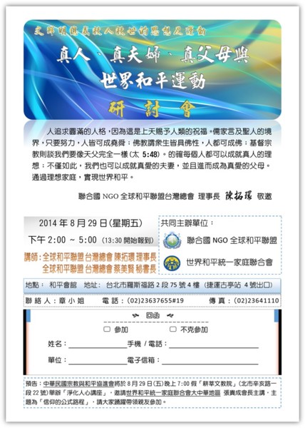 真人-真夫婦-真父母與世界和平運動,歡迎您來參加8/29的研討會