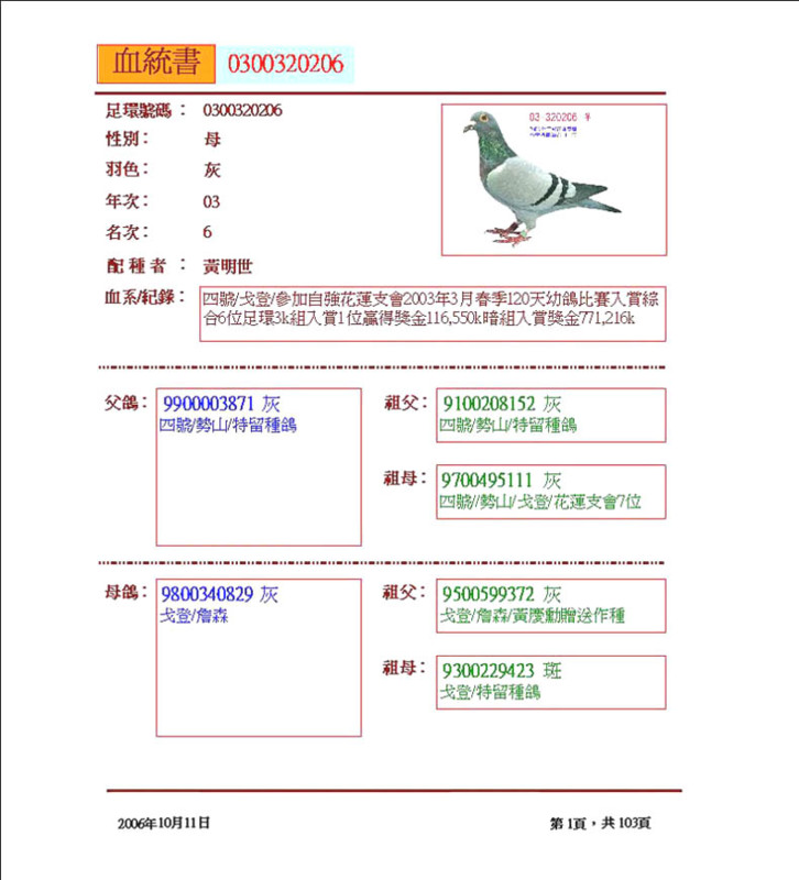看鴿子相關血統書的奧妙變化就樂在其中,俗語說『人不可貌相,海水不可斗量』個人認為看鴿子的血統要比看鴿子的外在體型來得重要,如果鴿友們有需要建立自己鴿舍種鴿血統資料,本人非常樂意來協助。