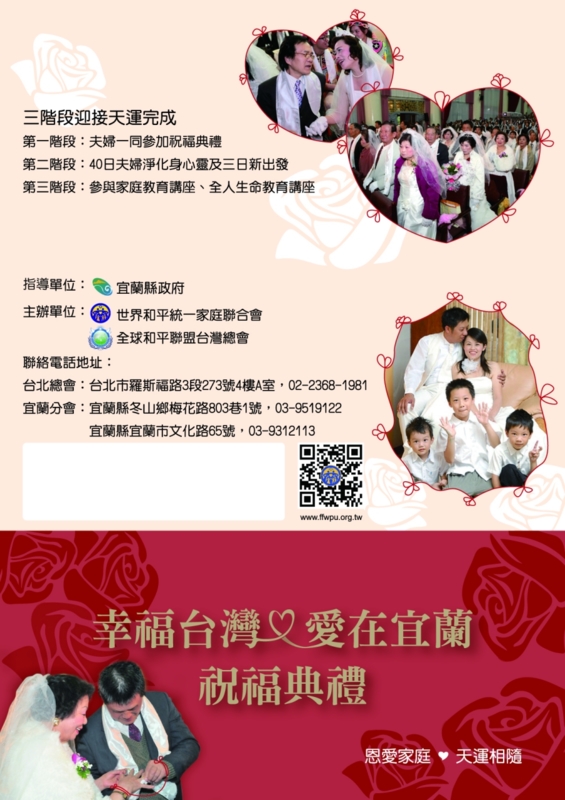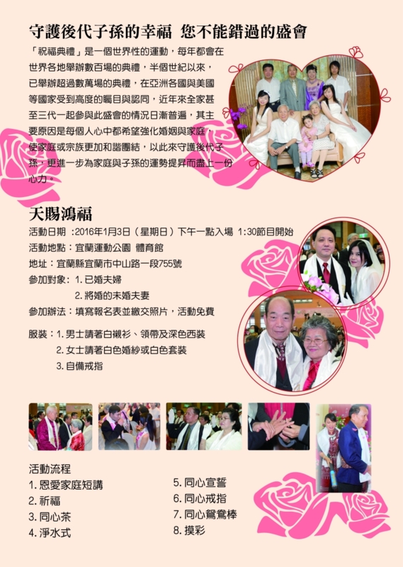 為要讓台灣全國的夫婦們,能夠迎接天地運勢,從上天繼承永恆的福份,庇祐我們的子孫與下一代,本會謹訂於2016年1月3日(星期日),假宜蘭運動公園 體育館 舉辦『幸福台灣 愛在宜蘭祝福典禮』,誠摯地邀請 賢伉儷出席,一同見證這場莊嚴美好的上天祝福,同享天運,開啟家運興旺的大門。
