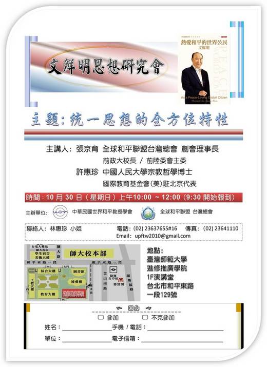 統一教創始人文鮮明總裁的思想具有非常廣泛的包容性,它融合東西方思想的精華,並且有許多原創性的思想,更重要的是有很多天啟性的內容,對於解決當代的問題,帶來許多的啟發,相信您若能參加,一定會有許多收獲。