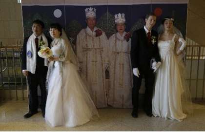 主會場的新娘們皆穿著婚紗出席。典禮上將有由400名組成的韓日合唱團獻唱。