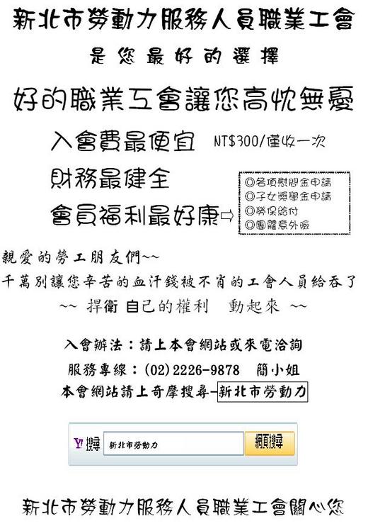 新北市勞動力服務人員職業工會 於 2011/09/29 10:40回覆