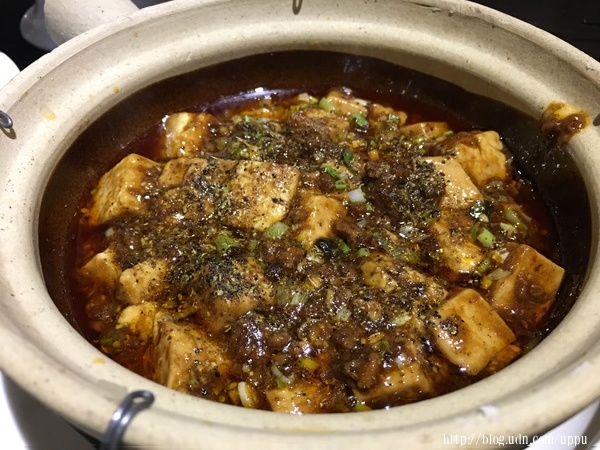 麻婆豆腐,不到十分鐘麻婆豆腐就上菜了。跟我想像中的好吃有段距離,這上桌時豆腐不是熱燙,因為在鍋裡燒後擺到這砂鍋,有換鍋的動作,特別摸了砂鍋是涼的,這樣的豆腐就只是熱的不是熱滾燙,香氣也沒有出來,真要論川味兒做的更好吃。