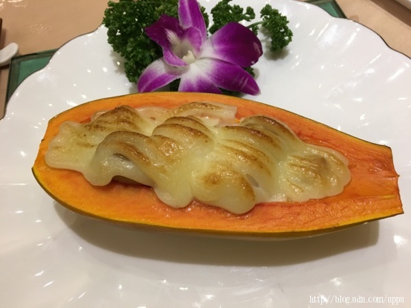 海鮮焗木瓜,美乃滋全部剝掉才肯吃。
