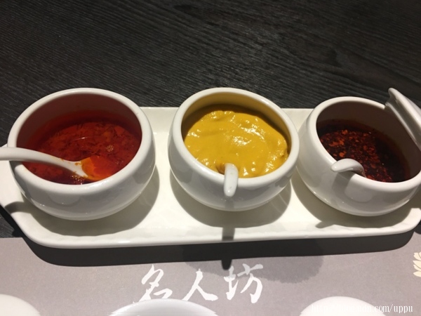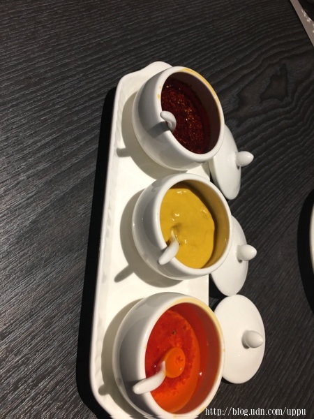 醬料,左邊是朝天椒、中間芥末、右邊辣椒渣。