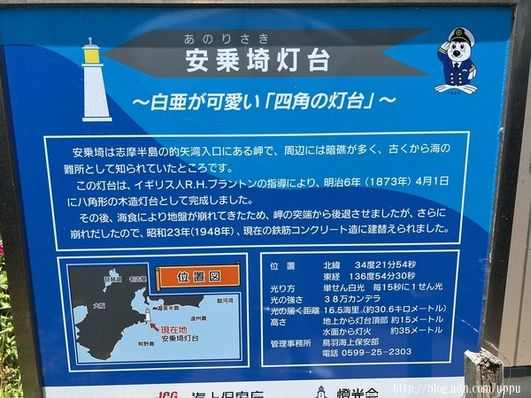 這座燈塔位於安乘岬,區隔波浪平靜的的矢灣與太平洋。現今雖是稀有的四方形,1873年建成當時是木製的八角形。在伊勢到熊野之間最早點燈的就是安乘埼燈塔,其位於一片草地園區對面,開放遊客進入參觀,從上方可眺望御前崎(靜岡縣),天氣好時還可看見富士山。