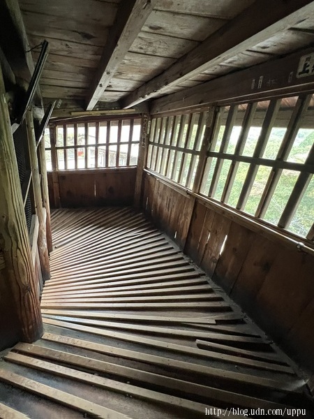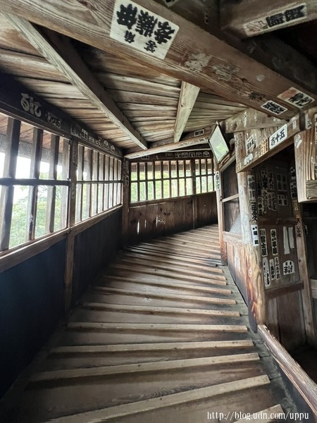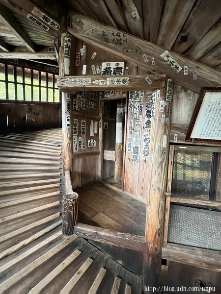 旅東北: 進入內部,可以一邊看著打斜的窗戶,爬上傾斜的坡道。上下行都是單行道,不會擦肩而過。有關結構起源有許多不同說法,包括由達文奇設計後傳入日本,或是住持在夢中獲得神啟,充滿謎樣氣氛。不知不覺就回到出口了,非常不可思議,歪斜的內部空間也十分奇妙,請務必到此親自體驗!