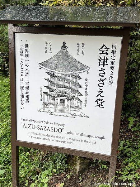 會津螺旋堂又名為「圓通三匝堂」,是「轉三圈」的意思,亦即在螺旋樓梯走上與走下的過程。信徒會在走樓梯的過程中,參拜 33 位慈悲的觀音菩薩。