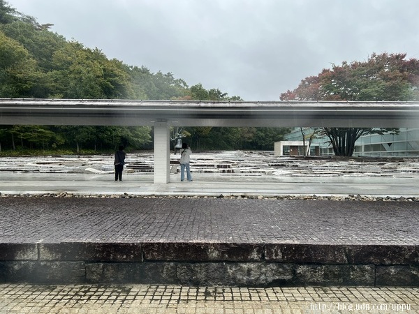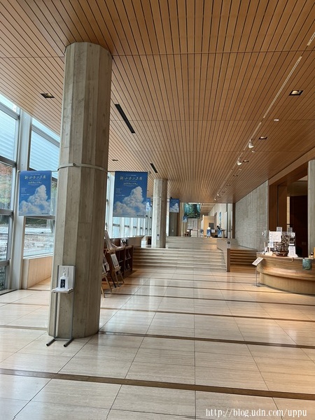 日本旅遊節錄: 進入館內,從大廳的大玻璃窗可一覽石庭與森林。內部大量使用木材,牆面則採用將混凝土倒入杉木模板製成的獨特建材。圖書室等處擺放的木椅與家具設計精緻,營造舒適空間。作為地方城市的美術館,規模相當大,尤其是英國近代美術收藏約有500件,系統性收藏了特納、沃特豪斯、雷諾茲、班-瓊斯等作品。此外,除了日本近代美術,還展示英國珍貴插畫書、幕末至明治時代的銅版畫與石版畫,以及與郡山有淵源的作家作品。