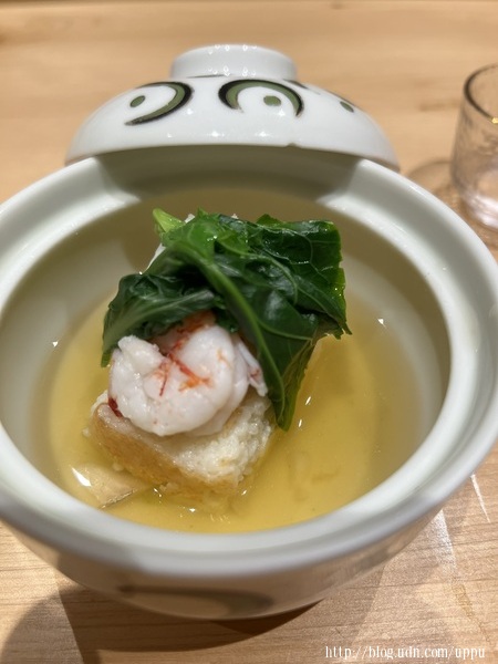 鯛魚及水針魚做的豆腐,上方是胭脂蝦及自家種的芥蘭