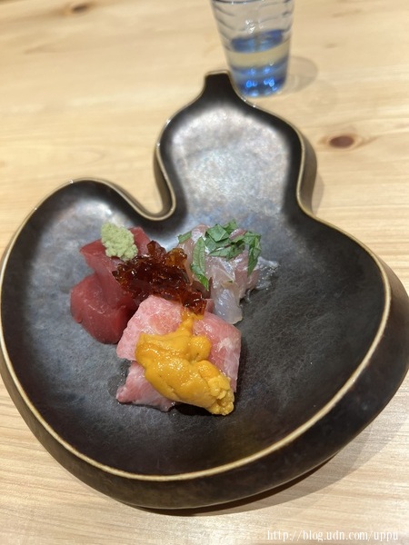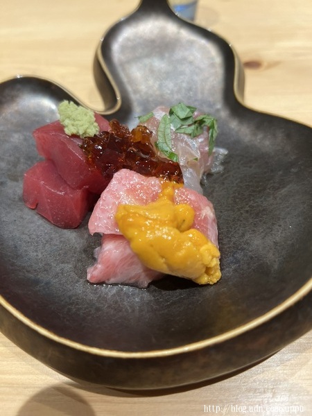 黃雞魚、黑鮪魚大腹、海膽、赤身,佐切丁的醬油凍。