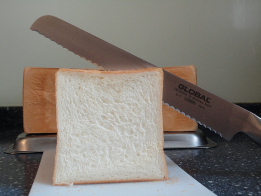 經過多次嘗試,終於做出令親朋讚不絕口的吐司,可惜用39元買的麵包刀把美美的吐司切得歪哥淒岔,所謂英雄配美人,破鍋配爛蓋,不凡的吐司也要搭配不凡的吐司刀,於是花了兩千元買了這一支寶刀,果然吐司與好刀相得益彰,氣勢不凡,是我家流理檯上最耀眼的明星.