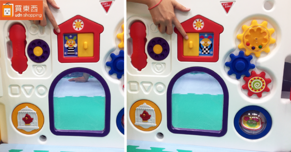 另一面遊戲圍欄更加厲害了,有窗戶、音樂鳥、復古電話、門鏡、球球滾滾還有轉轉齒輪,在在都充滿巧思。窗戶可以左右翻開,裏頭有可愛的小動物會和寶貝Say Hello~