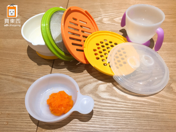Combi的這款分階段食物調理器,餐具耐熱度都達140°C,可蒸氣消毒、微波(綠色不锈鋼網除外),其中最方便的地方在於,它具備5項調理功能(過篩、磨泥、切塊、磨碎、餵食),能做出多種變化的副食品。第1階段的綠色不銹鋼網能將食物「過篩」,同時去掉較難消化的食物纖維,製作出適合5-6個月寶寶能食用的糊狀副食品。