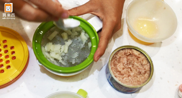 第3階段的黃色小洞磨碎盤同樣有粗/細兩面可用,能將食物「切塊」,讓9-11個月的寶寶食用。