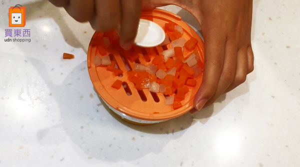 將紅蘿蔔削皮後切塊,要記得,因為是給寶寶吃的,蘿蔔要切的小塊一些。接著同樣倒入磨碎碗中,加入少許的水後,放進微波爐,隨後將紅蘿蔔中的水倒掉。