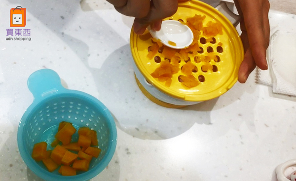 第2階段的橘色條狀磨碎盤分為粗/細兩面,可將食物「磨泥」,讓7-8個月寶寶開始訓練咀嚼。