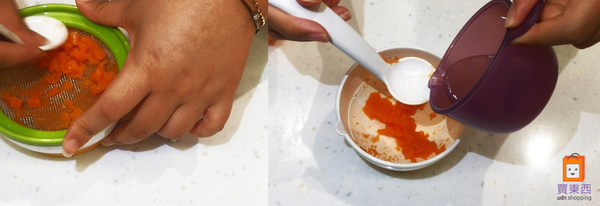 接著將微波好、已軟化的紅蘿蔔放到第1階段綠色不锈鋼網上,用小勺將紅蘿蔔壓成糊狀,小貝比才好入口。