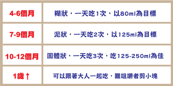 一般的寶寶大約在4-6個月大時,就可以開始接觸副食品,4-6個月可以提供寶寶「糊狀」的食物,一天吃1次為目標,目的只是為了讓寶寶適應與嚐鮮;7-9個月可以嘗試泥狀食物,並開始慢慢調整吃的份量與次數,一天吃2次;10-12個月可開始吃固狀的食物,一天吃3次,調整吃飯的時間點,讓寶寶習慣與爸爸媽媽同桌用餐;1歲大之後,寶寶基本上已經可以跟著大人一起吃了,但某些較難以咀嚼的食物像花枝、魷魚、金針菇等...則可以剪成小塊狀讓寶寶食用。