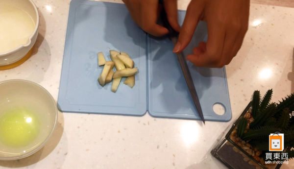 想製作「馬鈴薯鮪魚混合煮」,首先要準備好馬鈴薯20g、水煮鮪魚10g,將馬鈴薯切5mm厚,並倒入水後放置一段時間,將馬鈴薯軟化。