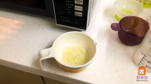 接著將紅蘿蔔、白蘿蔔切5mm厚,加入少許的水,放入微波爐微波。