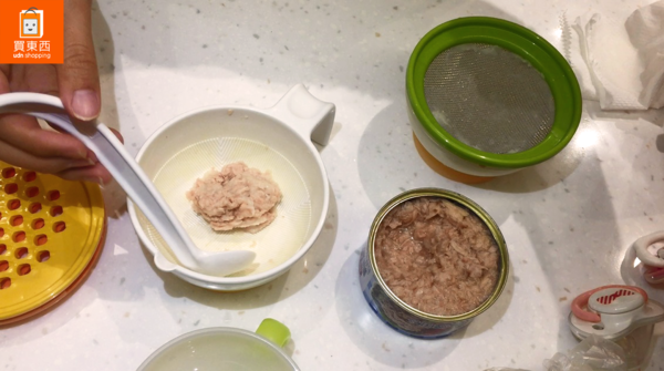 接著從水煮鮪魚罐頭中挖取適量的量,加入水以淡化鮪魚鹽分,將不必要的水份瀝除之後,最後用紙巾吸掉多餘的水份。
