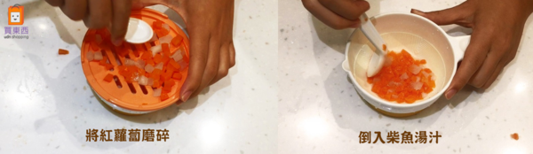 接下來,將微波好且軟化的紅蘿蔔與白蘿蔔,運用第2階段的橘色條狀磨碎盤將食物磨碎、磨細,最後再倒入一開始製作的柴魚湯汁,就完成囉!