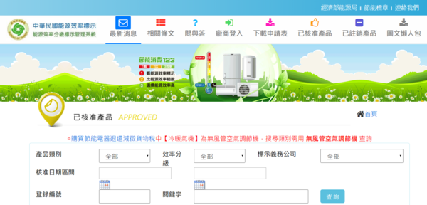 可以從 中華民國能源效率管理系統,關鍵字欄位輸入廠牌、型號查詢政府核可的補助型號。