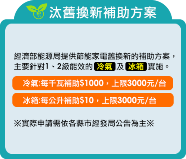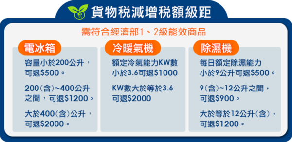 汰舊換新節能補助如果符合資格,是可以與貨物稅一起申請,主要針對1、2級能效的冷氣及冰箱實施。