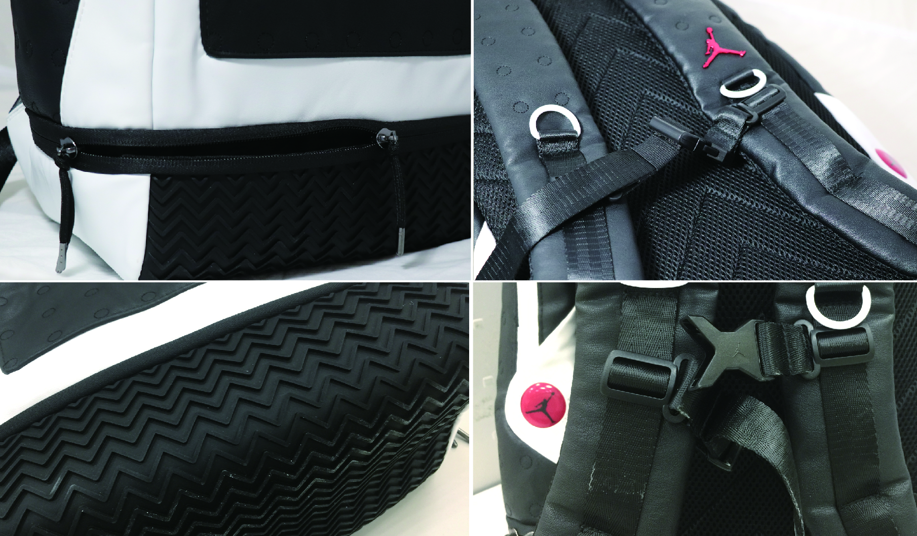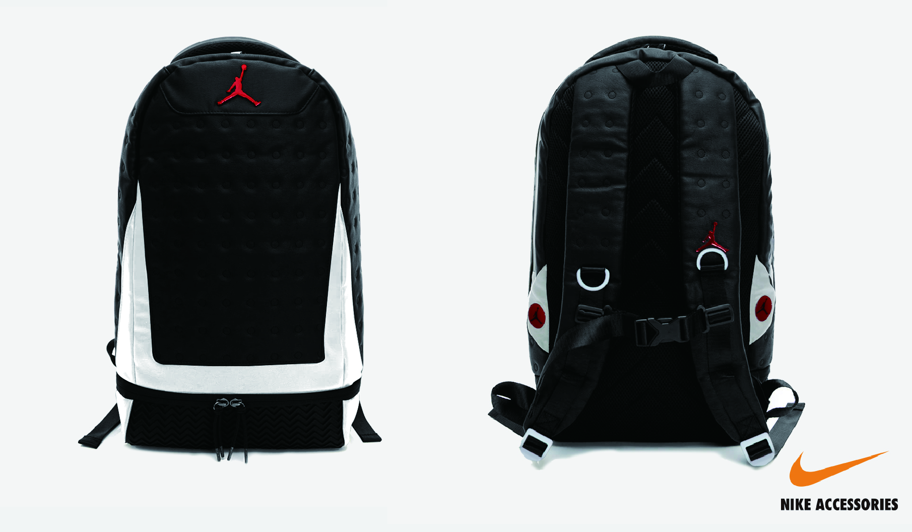 這款後背包設計靈感來自1997年喬丹在芝加哥公牛隊贏得三連冠時在場上奔跑時所穿的同名鞋款,NIKE JORDAN RETRO 13 PACK在外型上以黑白皮革材質拼接,在包的正上方壓上顯眼的紅色金屬經典跳投logo,除此之外,在肩帶及包包兩側也都有,因此背上它,無論從任何角度,都能看到這個經典標誌!