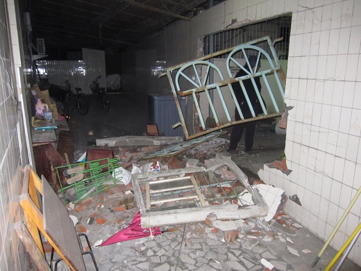 窟窿,磚塊、石灰塊、鐵窗、窗框等雜碎物掉滿地,慘不忍睹,太太