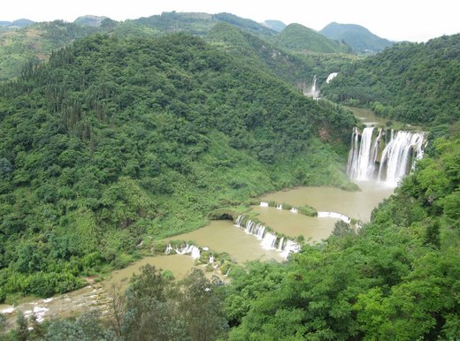 形式瀉落,共有7級,總高15米,瀑寬80米,兩岸古木修竹,色彩豐