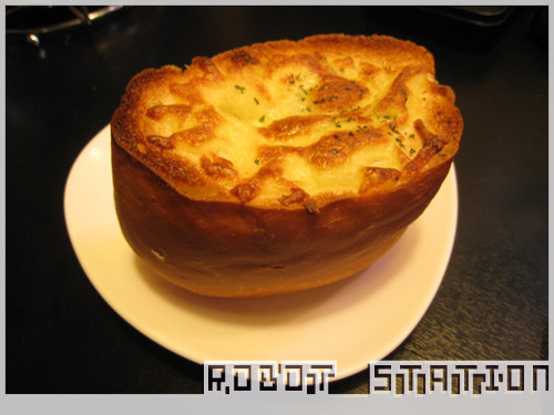 口袋怪獸麵包(90元),有七種口味,我們點的是燻雞,切了一半的麵包,外頭烤的酥香,裡面挖洞擺餡料,外層用濃濃的起司封口,非常特別!