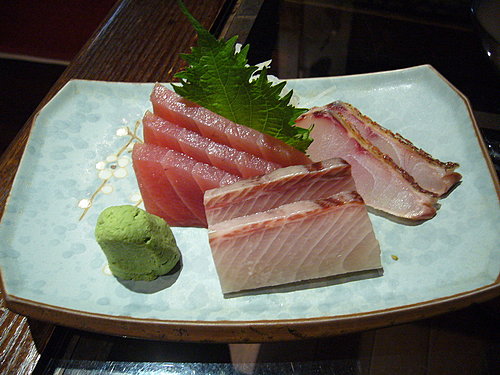 明太子炒花枝,明太子的鹹香襯托出花枝的鮮嫩和洋蔥甘甜。「川前屋」日本料理做的黑鮪魚,在正統中加入不少創意,像在頂級黑鮪生魚片灑上柚子粉,讓果香消除過於油膩的口感。
